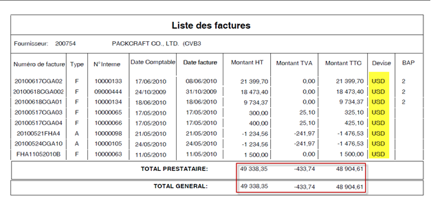 3rd page for fee only invoices (no PA code) of 1st supplier2nd example Single supplier, single currency search3rd example: Single supplier, multiple currency searchA new Write e-mail window will open.Click on the “Print" button. The list of print templates available on this screen is displayed. To make the most of this template, the search criteria should be carefully chosen.In this case a Send report by e-mail type of window will open.The invoice fee list is displayed.